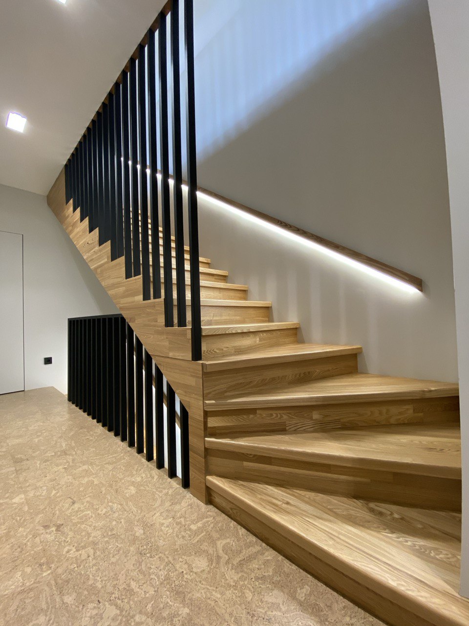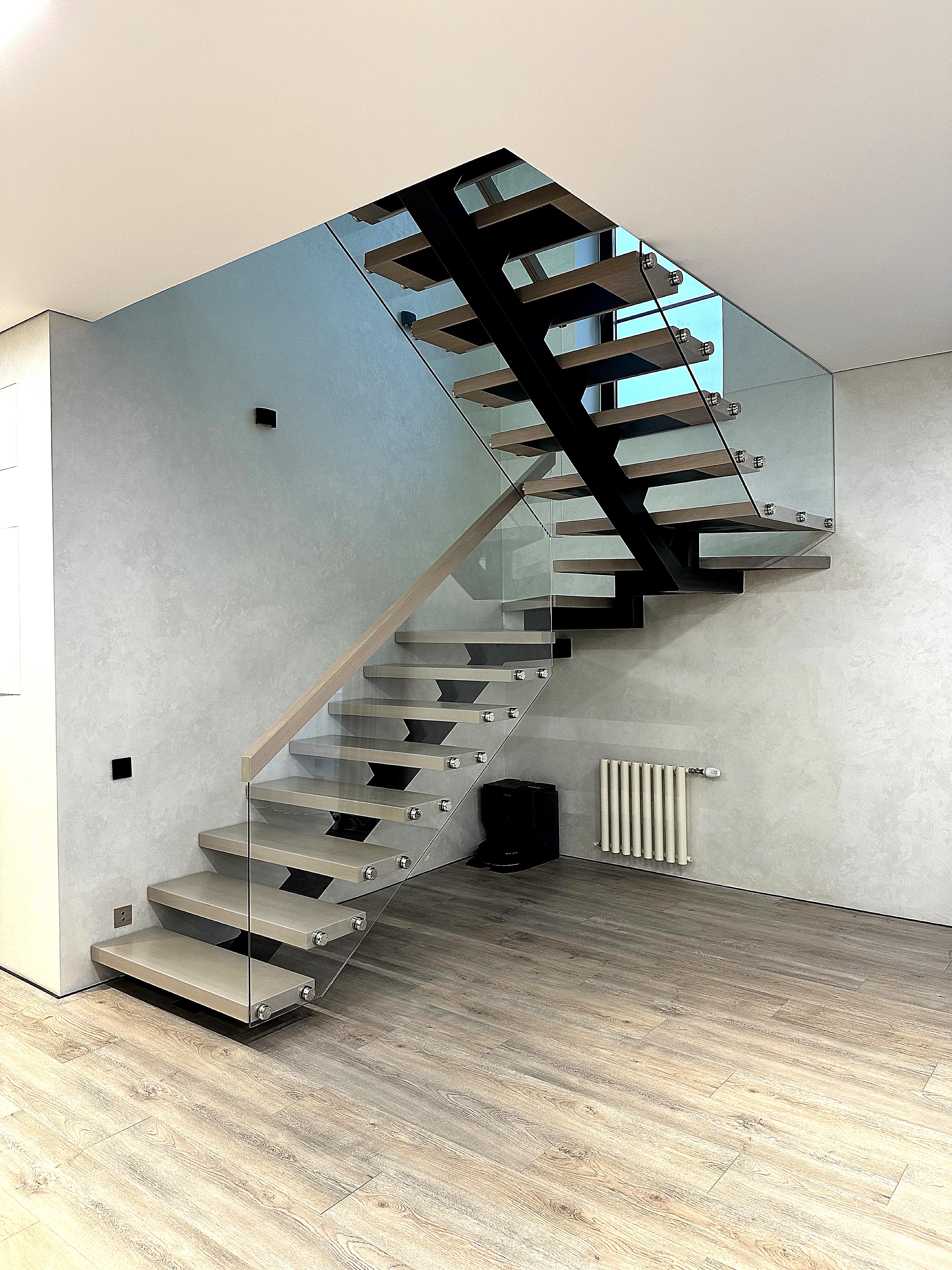 Ступени монтируются на открытый каркас — без подступенков. Свет проходит сквозь конструкцию, лестница выглядит лёгкой и «воздушной».