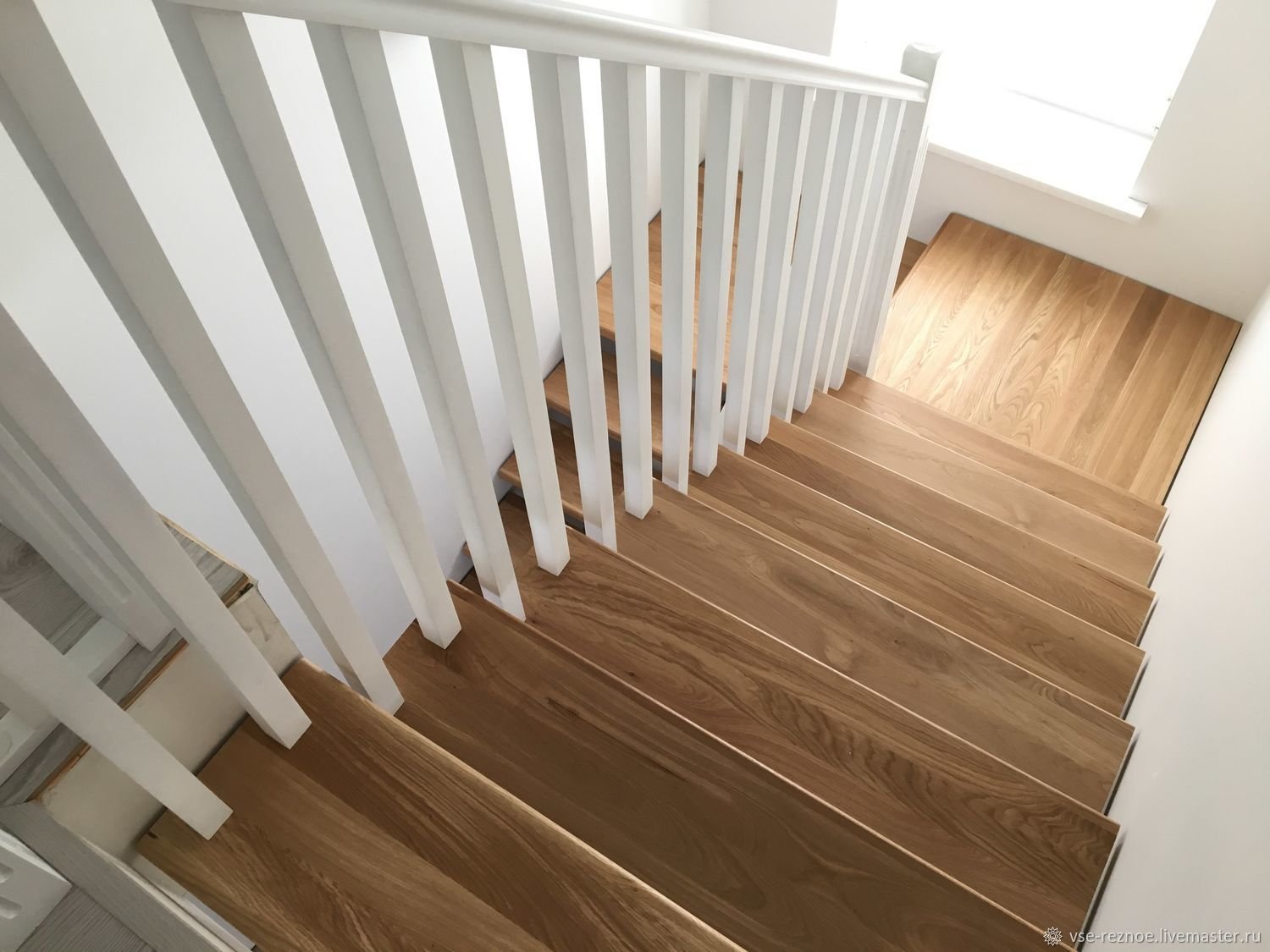 • Подоконники — из массива дерева, в цвет лестницы или пола. Чистовая подгонка, тонировка в цвет лестницы, скрытый крепёж.