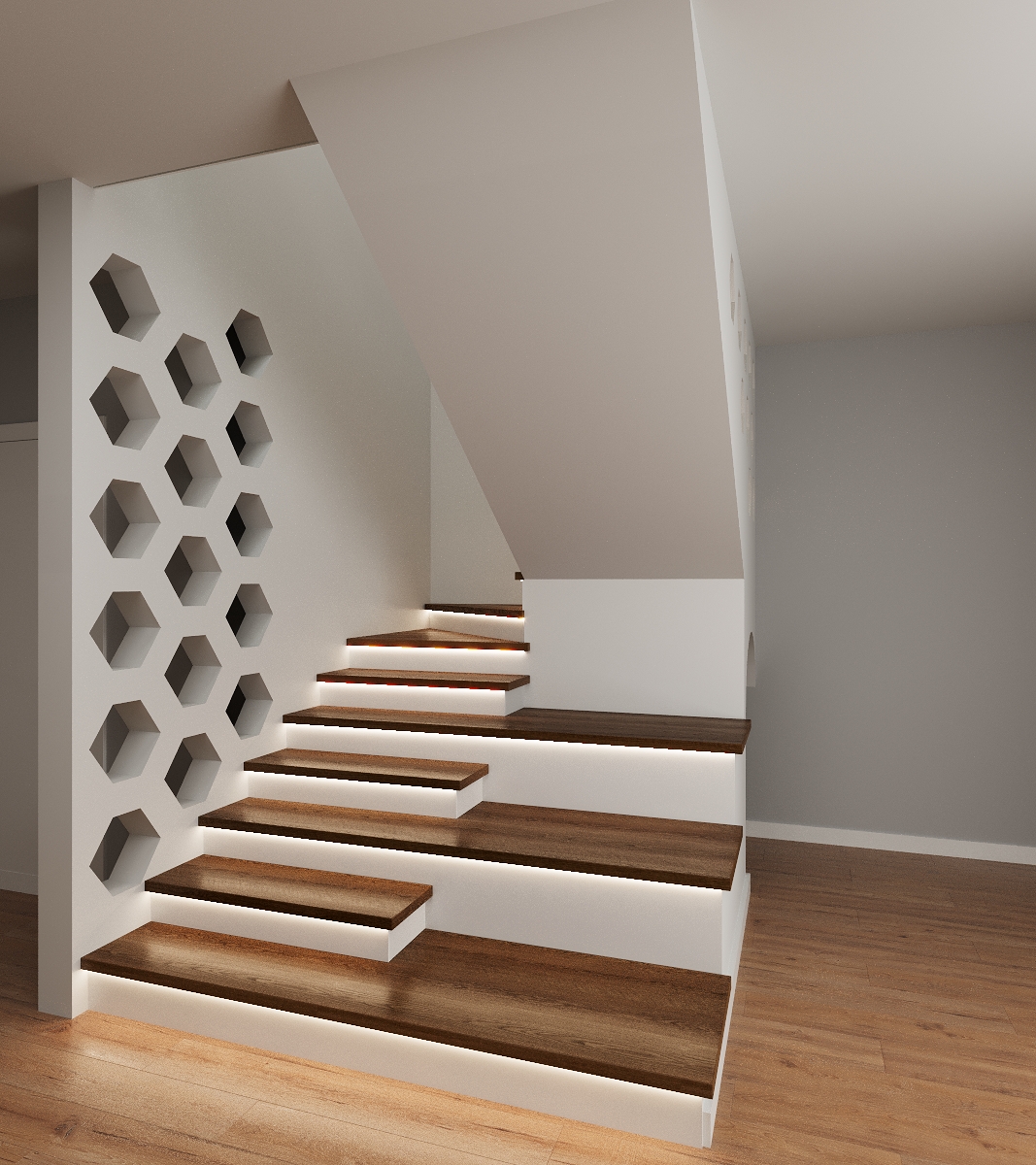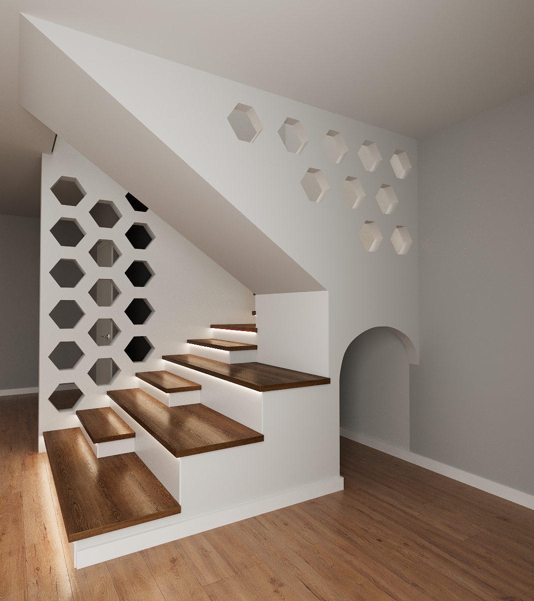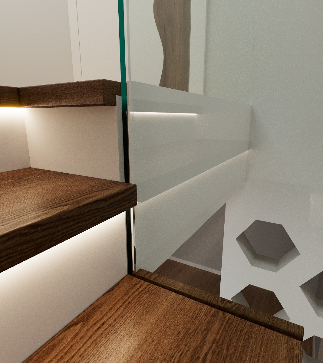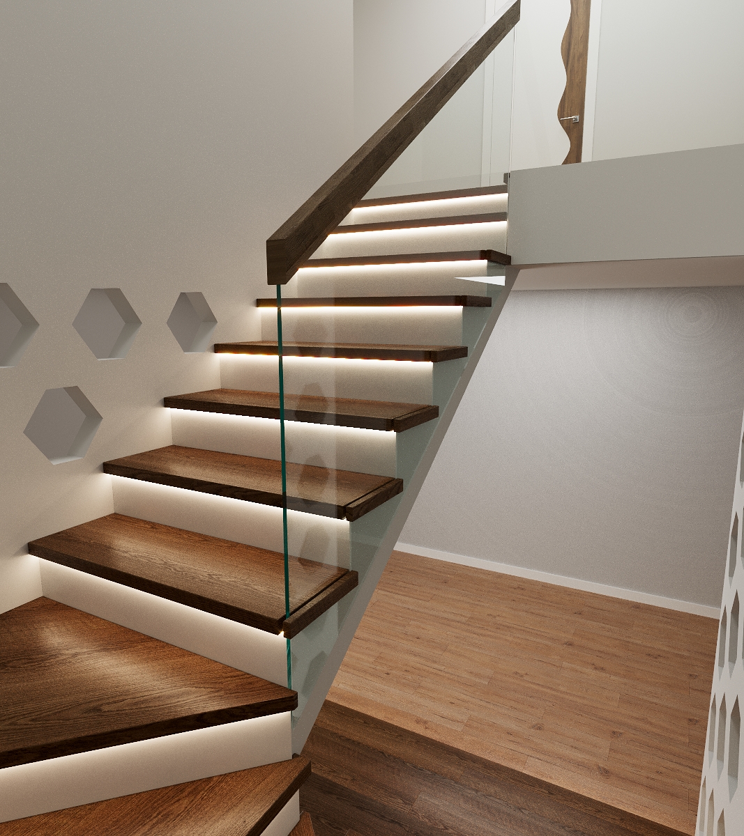 Первый марш оформлен сценками, что добавляет уюта и функциональности. Заказчик хотел лёгкость и эстетику — получилось лаконично, но выразительно.