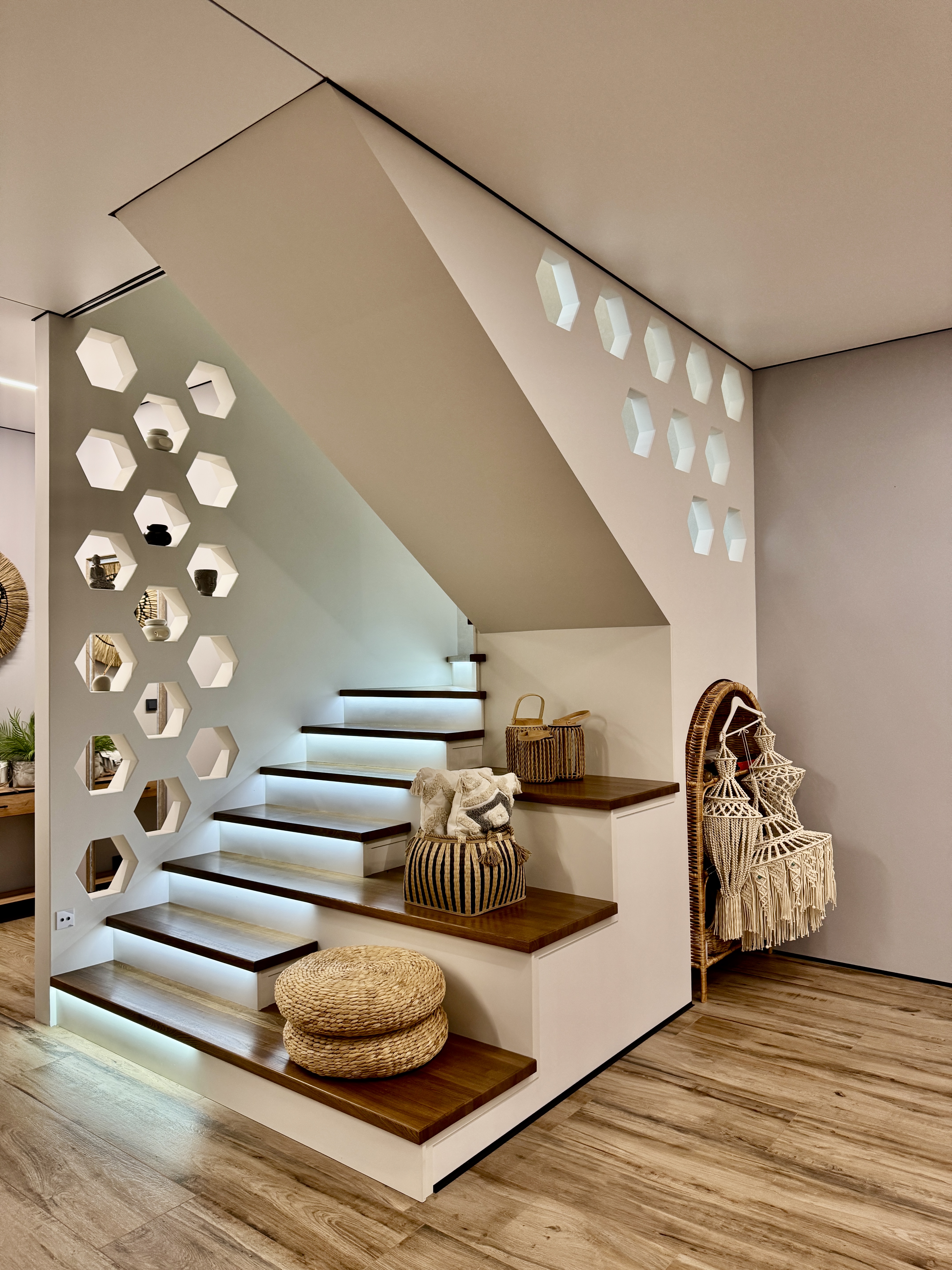 Ступени облицовываем деревом. Подступенки — чаще из МДФ, в тон ступеней или под цвет стен. Всё подбирается заранее — под стиль интерьера и конфигурацию проёма.